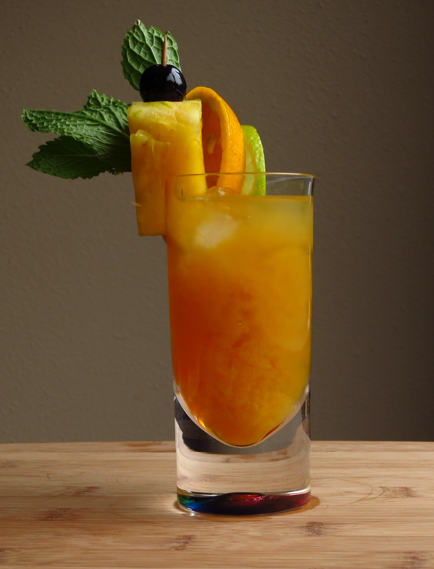 Shake and then serve on the rocks. Garnish with pineapple wedge, brandied cherry, sprig of mint, lime wheel and orange wheel.