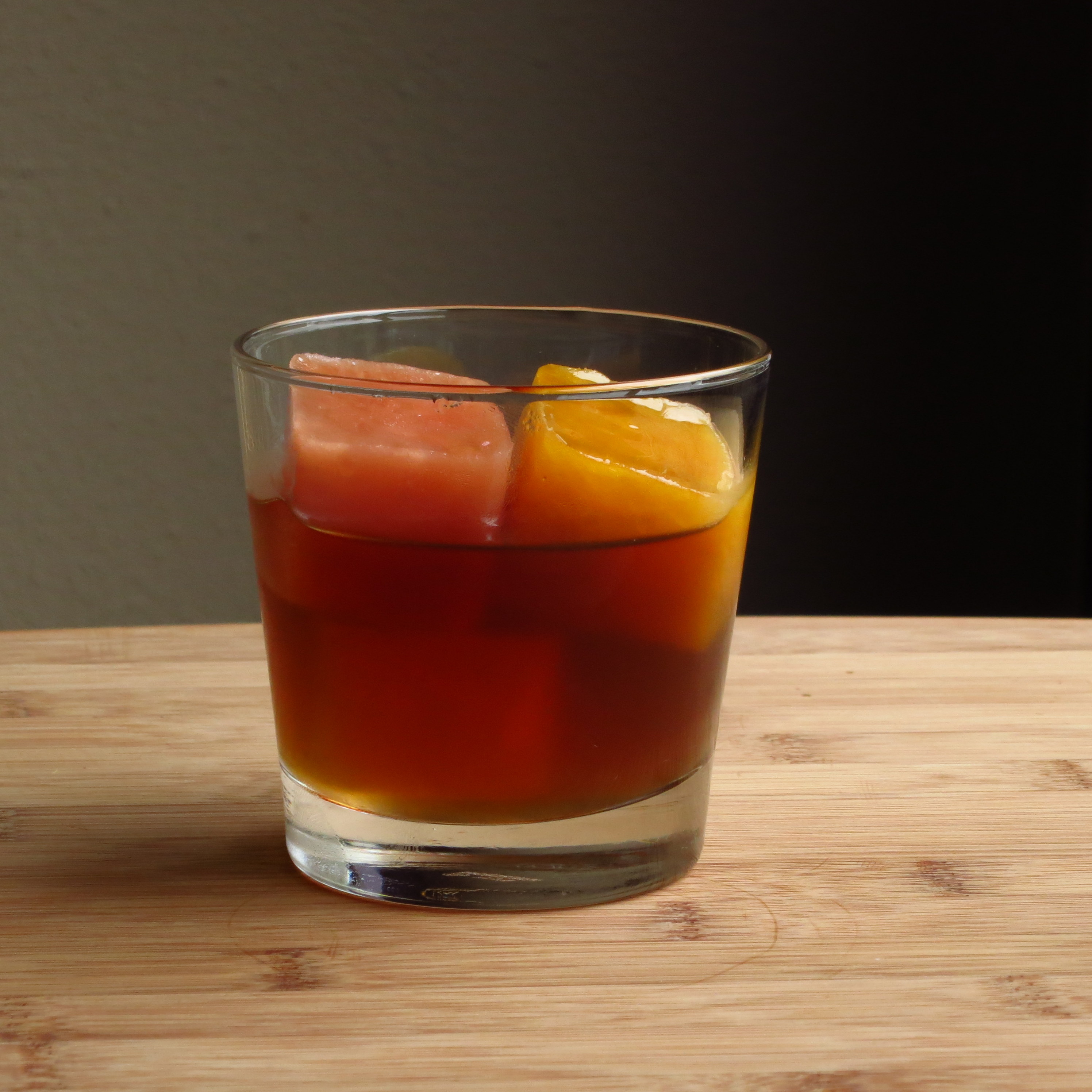 This is a fairly stiff drink that begins spirit-forward like an old fashioned and devolves into a tiki drink. Starts off with the richness of the rum, lots of vanilla and caramel flavors, then some spiciness from the cognac and the faintest hint of anise from the absinthe. The finish picks up the chamomile from the bitters and the first hints of fruit from the cubes. As the cubes dissolve, citrus and tropical fruit notes join the party, and the drink grows sweeter as well. The contrast of the fruit brings out more of the barrel funk in the rum, and the lime makes the absinthe pop a bit more. Once the cubes are melted, lush tropical fruit flavors dominate.