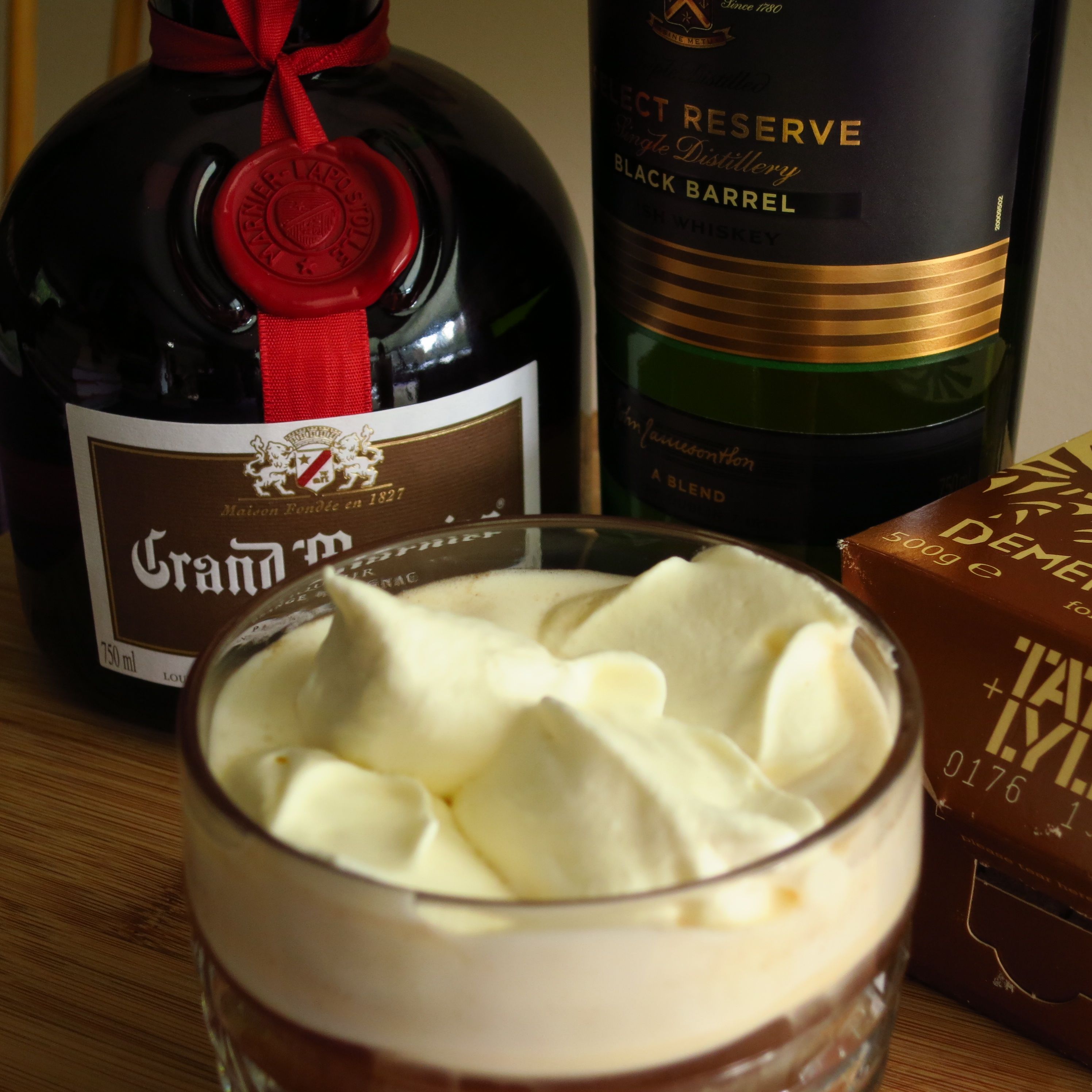 First, we selected our coffee, a nice dark brew of Caffe Ladro Diablo, and our whiskey, the Jameson Black Barrel, for a rich and delicious base. Then we tried the coffee and whiskey together with a range of liqueurs, finally settling on a combination of Grand Marnier and demerara sugar for one variation, and the Amaro Montenegro and Barenjager for the other.