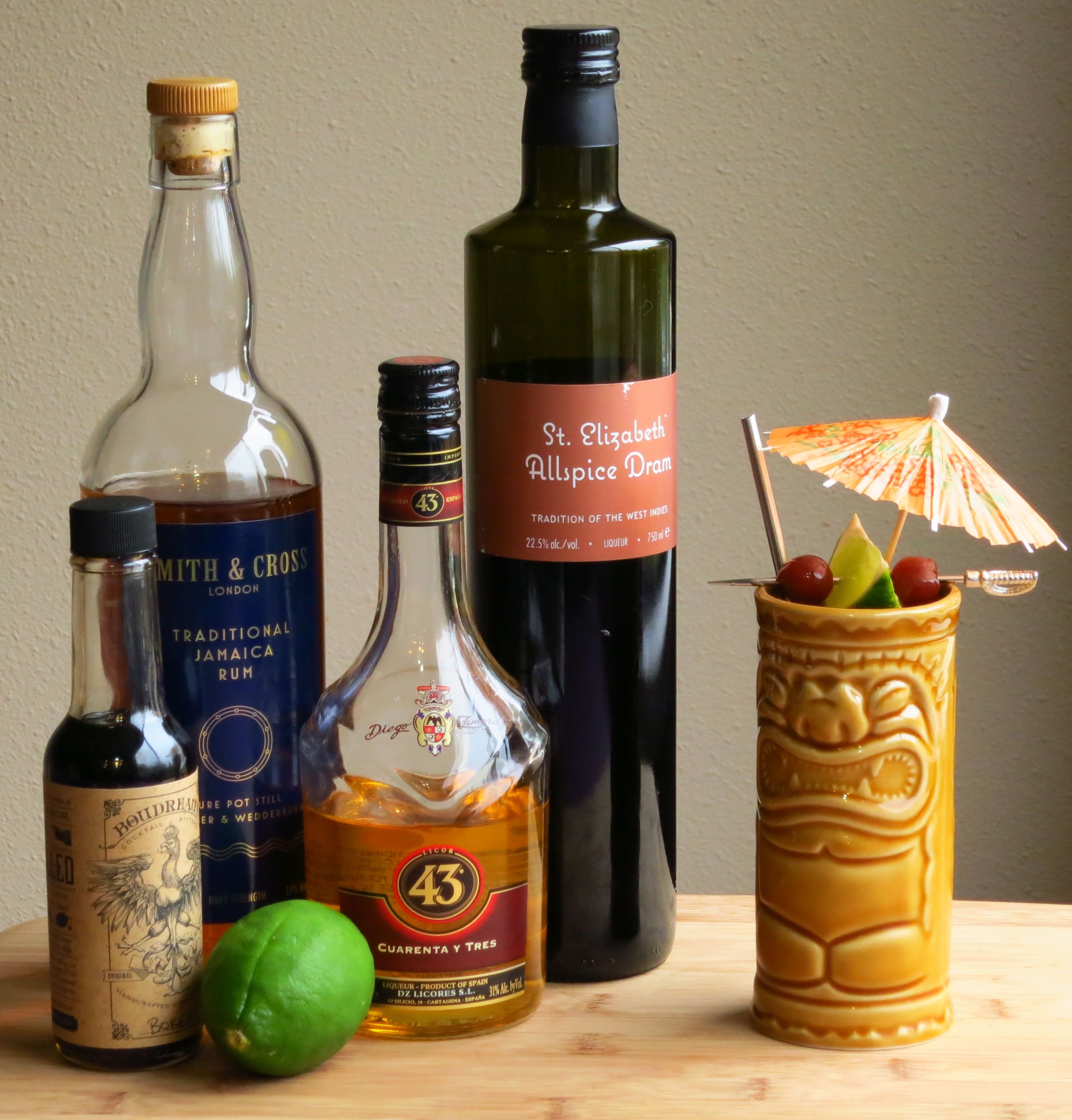 First up we have the Cargo Cult. We recently received a bottle of Licor 43. (See our samples policy for what that means.). We felt that its strong, true vanilla notes would make a nice addition to a tiki drink. We started by pairing it with okolehao (a Hawaiian rum made out of ti root), which was nice. Then Christa asked what would be a good substitute if people don’t have okolehao, since it isn’t that common. It’s strong, a little sweet, and a little funky, so we thought Smith & Cross Jamaican rum? Turns out that was a better pairing yet, so we started with that. Since we were aiming for tiki, we then tried different combinations of tropical fruits, including guava, passion fruit, coconut, etc. After a lot of tasting, we settled on a combination of guava and coconut. Tasty, but it needed a bit of acid to balance things out, so we added some lime juice. Better, but still not perfect. So we added some Boker’s bitters which we recently acquired from Canon (thanks, Jamie!). Better yet, but still not there. Finally, we added a dash of allspice dram and that was the ticket to bring this drink together.