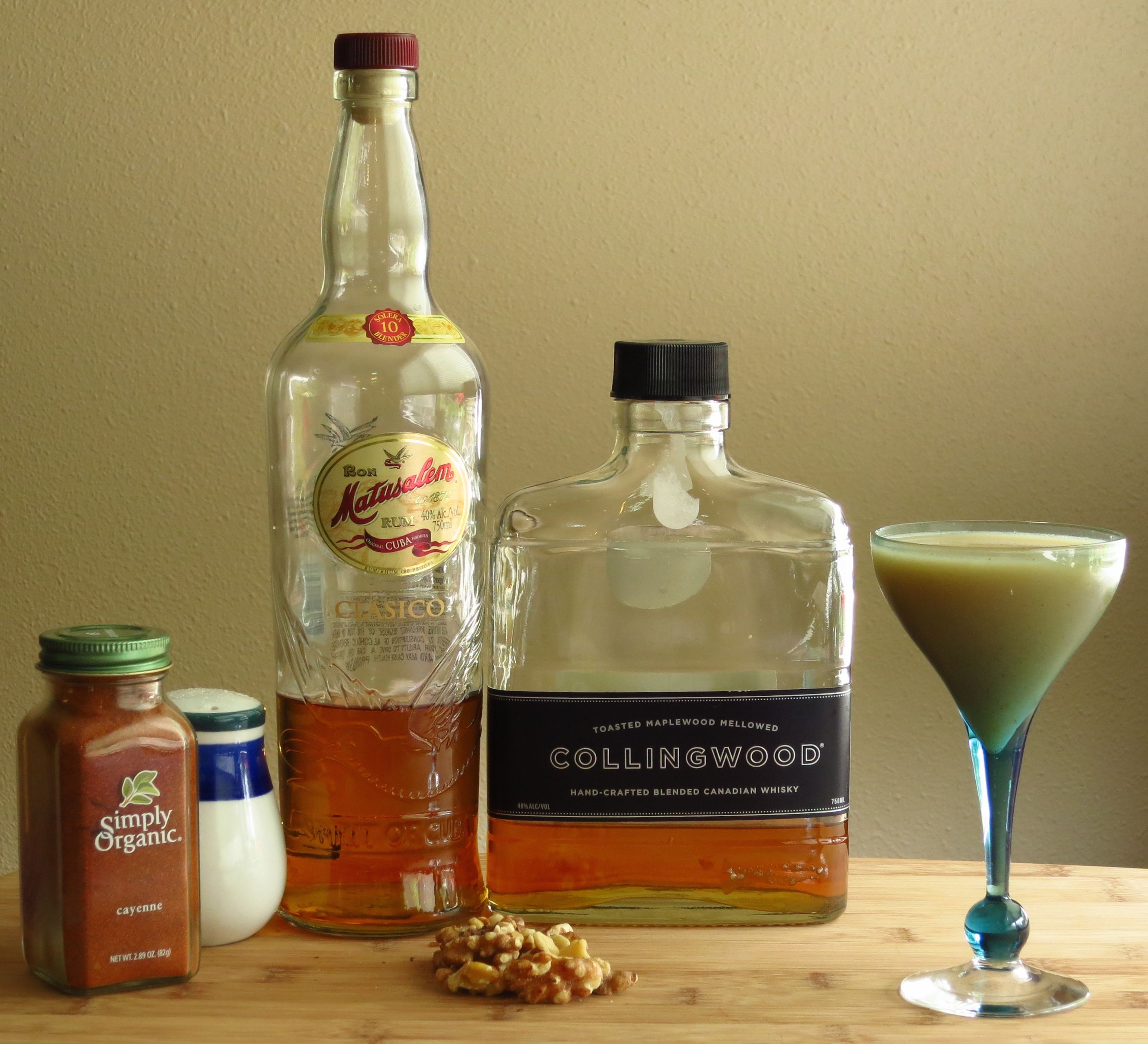 For our second drink, Shaun wanted to come up with something that evoked the cocktail nut (sweet, salty and spicy) mixes that he remembers from growing up in the 70’s. We started with toasted walnuts, muddled them with simple syrup, then added salt and some cayenne. We then tasted that in combination with various aged spirits. After tying a number of variations, we settled on a sweeter aged rum along with a splash of maple wood aged Canadian whiskey. The rum gave the drink some rich sweetness, and the whiskey added some earthy complexity that we really liked. These things combined made us think of the cocktail parties of the 70’s (not that we were drinking in those days :)), so it seemed appropriate to name it: