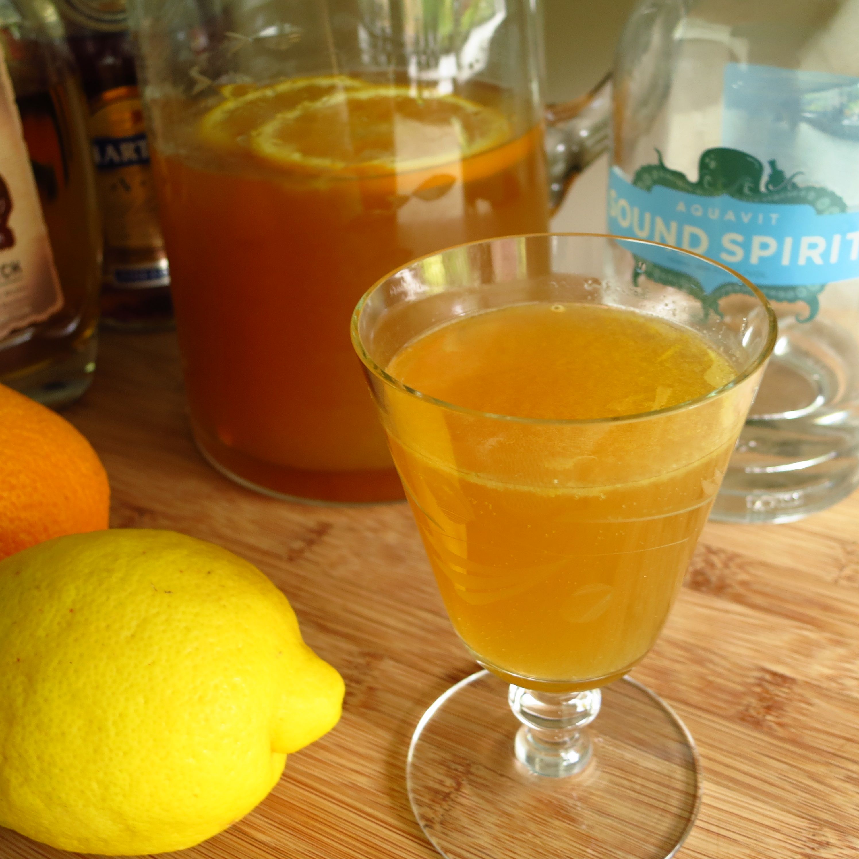 Aquavit is a very under-appreciated spirit in our minds, kind of the red-headed stepchild compared to gin. Which is too bad, since it adds some really nice complexity to cocktails, plus savory notes that you just don’t expect. So we were happy to be able to use it to good advantage in our punches this week.