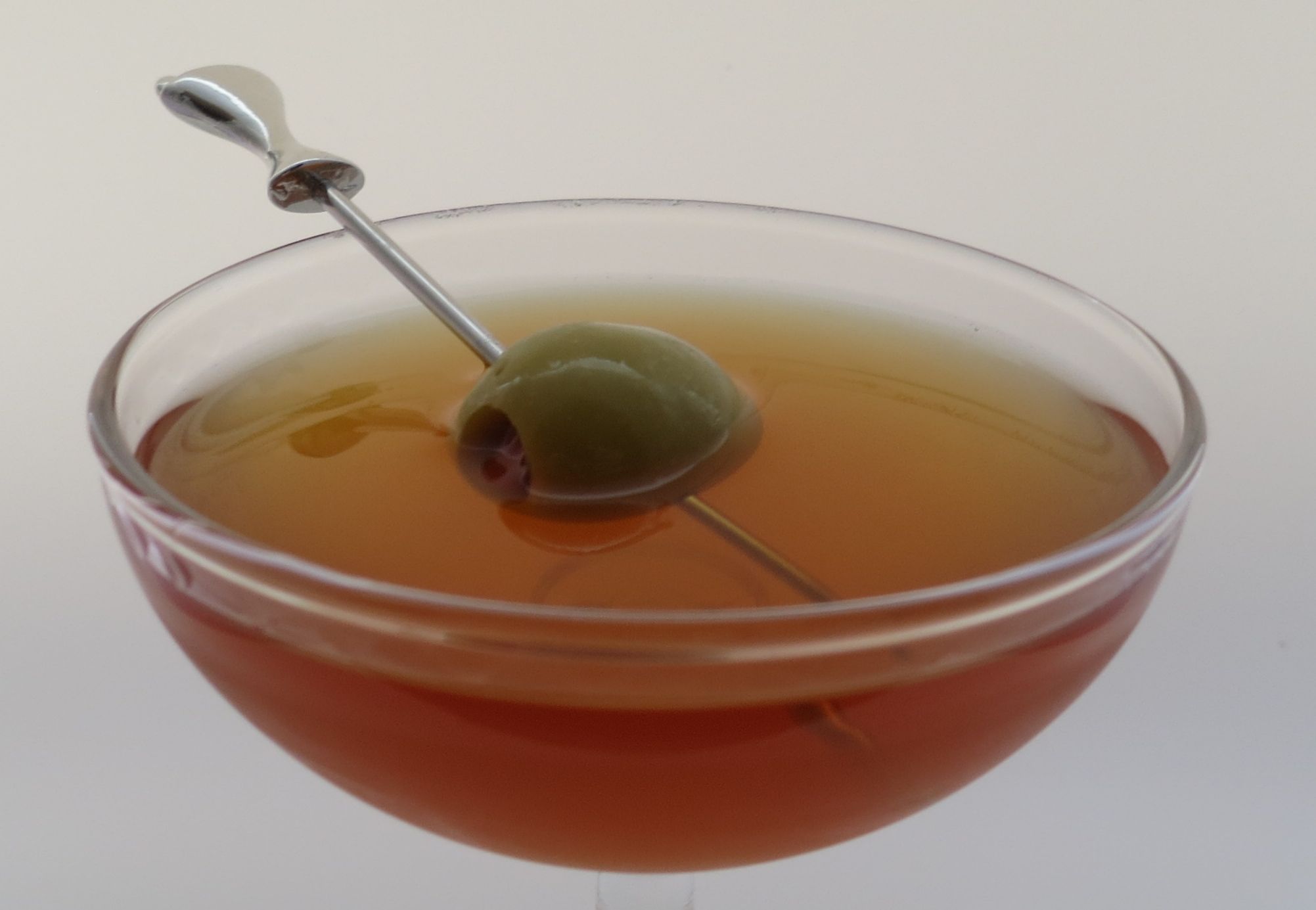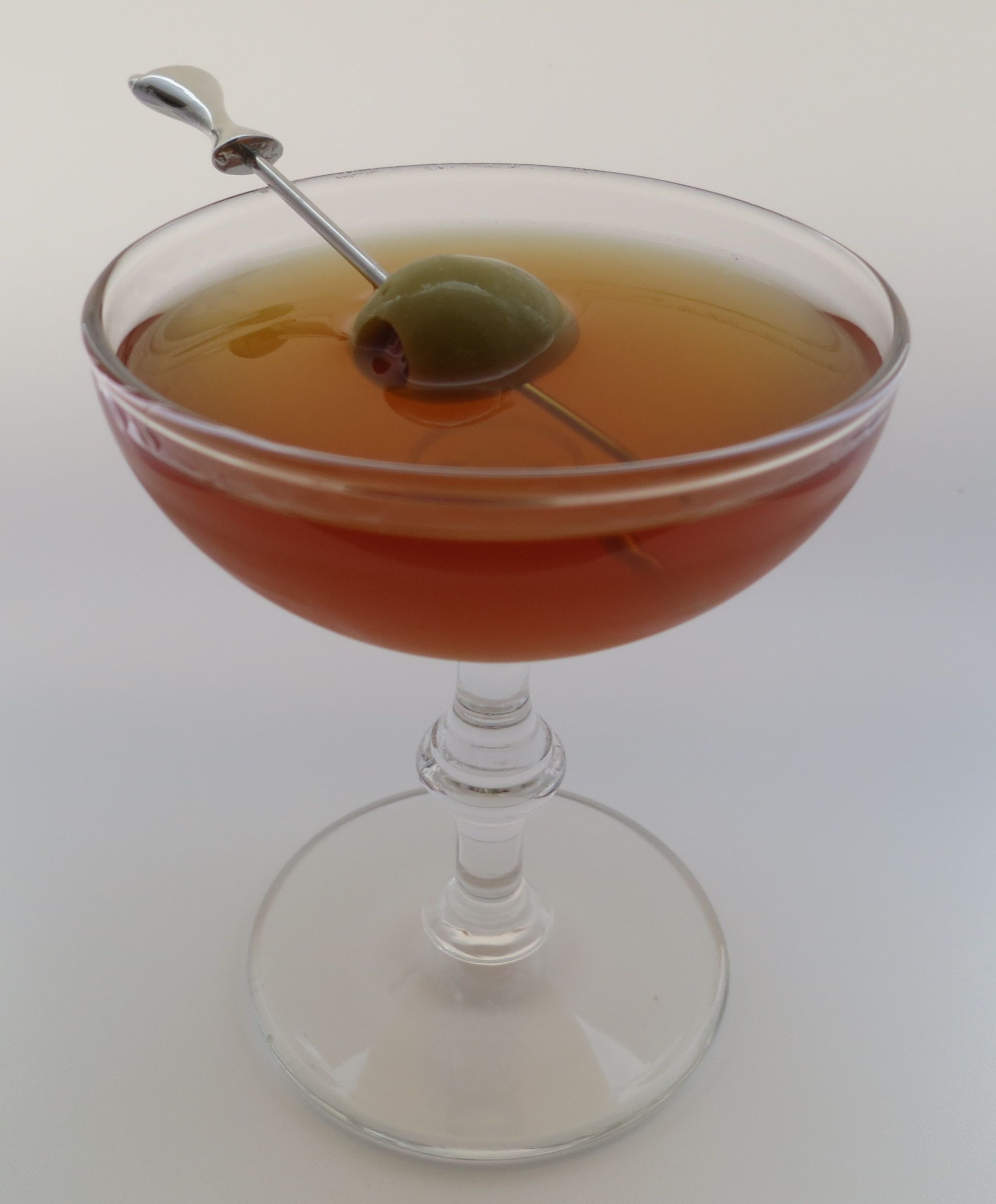 Stir first 3 ingredients with ice. Strain into a martini glass. Garnish with an olive. Add a float of smoky scotch.