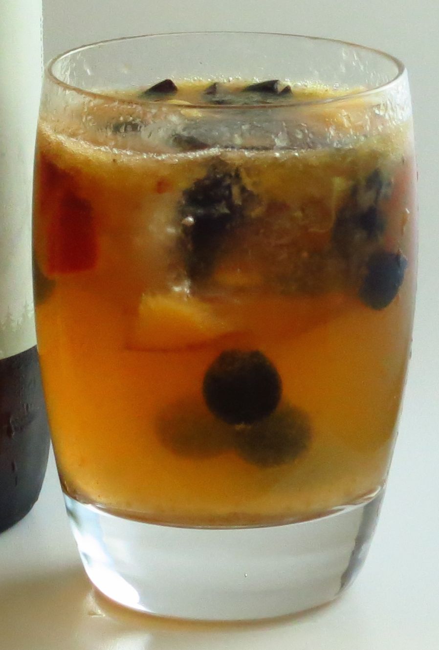 - Sliced fruit. For this particular version we used nectarines and blueberries as we felt those would pair well with the mint and basil. 1/2 a small nectarine and ~10 blueberries per drink.
