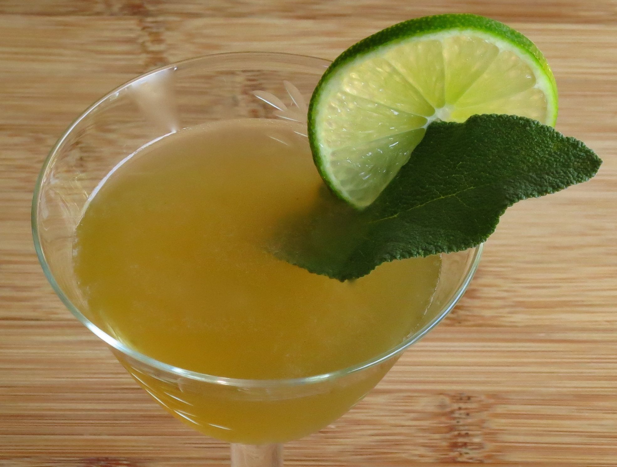 Muddle sage leaves. Add other ingredients. Shake with ice. Strain into a glass. Garnish with a sage leaf and a lime wheel. Enjoy!