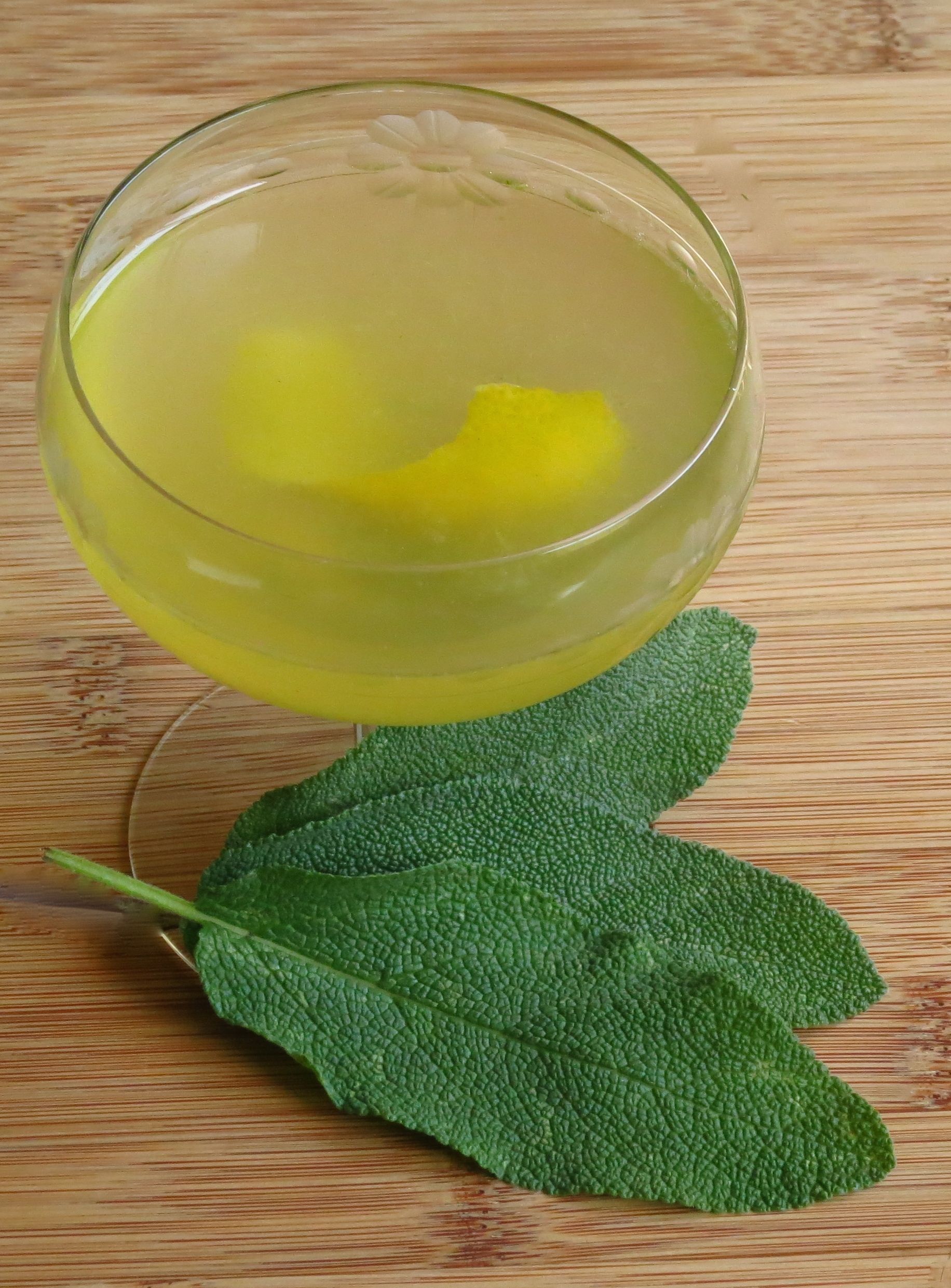 Muddle sage leaves. Add other ingredients. Shake with ice. Strain into a glass. Garnish with a lemon twist. Cheers!