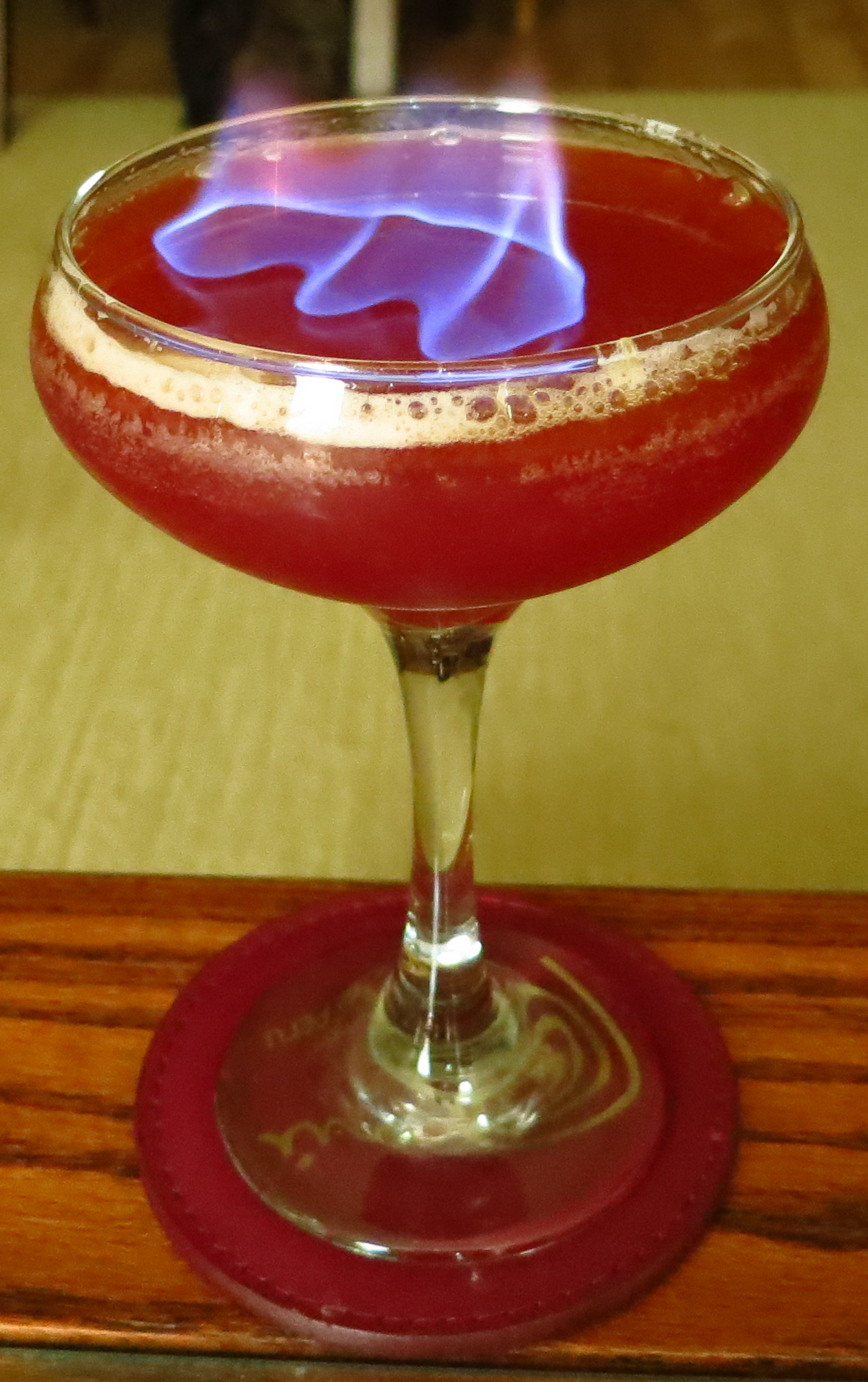 We started off thinking of doing something Dia del Muerto-inspired using mezcal. But then we thought of our host, and doing something tiki also seemed like a fun idea. But could we munge them together? We haven’t seen many mezcal-based tiki drinks, so that seemed like a good challenge. We pulled out the mezcal and some typical tiki ingredients and started experimenting. We ended up with something that looked pretty gory and tasted delicious – theme achieved! A libation appropriate to toasting fallen comrades. But why stop there? Nothing wrong with going with both tiki bowl and Halloween bonfire tradition and setting that shit on fire to boot. So we did 🙂